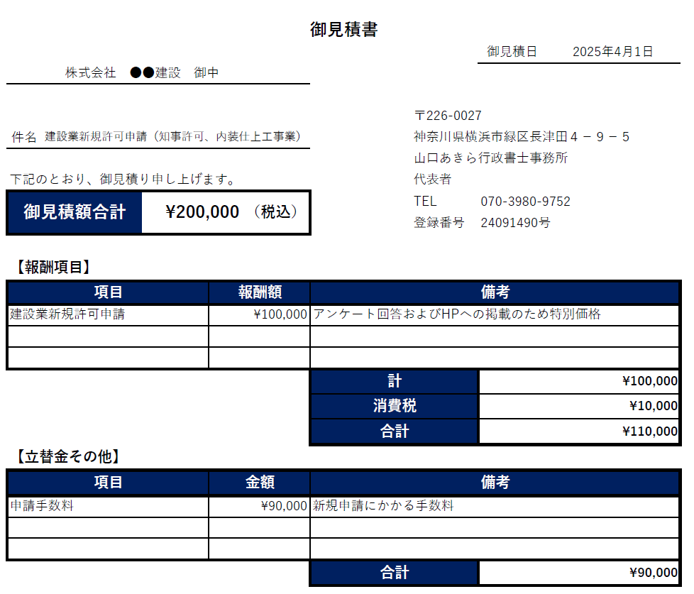 一般建設業の許可取得の場合、当事務所への報酬が110,000円(HP掲載等による特別価格)、県への申請手数料が90,000円、その他必要書類取得(履歴事項全部証明書など)の必要経費などもあるため、約21万円程度となります。